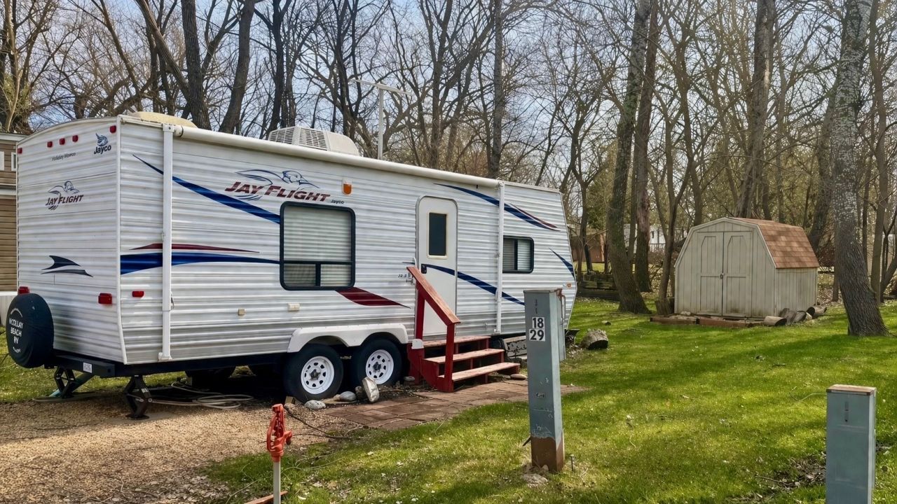 Nice shaded lot featuring a 2010 Jay Flight 22FB travel trailer in a cul-de-sac. The trailer offers one bedroom, a full kitchen, sofa, and dinette, comfortably sleeping 4-5 people. The lot includes a gravel driveway, 8x8 storage shed, and common ground to the rear. Trailer amenities include roof A/C and heat, all appliances stay (refrigerator, stove, microwave), hot water heater, all lighting fixtures, and a new mattress in the bedroom. A portable fire pit, TV and DVD, and antenna are also included. Conveniently located just a short distance to Pool 2 and the beach, and close to the comfort station, making this an ideal setup. Call today for a showing! Please note that Woodhaven Lakes is a gated recreational community and cannot be used as a primary residence or homestead. You must be accompanied by a broker to view any properties, YOU CANNOT ACCESS THE CAMPGROUND WITHOUT A PASS. The property owner pays the association fees.